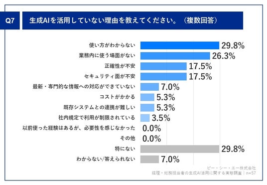 Q1で「活用していない」と答えた方に、「Q7.生成AIを活用していない理由を教えてください。(複数回答)」(n=57)と質問したところ、「使い方がわからない」が29.8%、「業務内に使う場面がない」が26.3%という回答となりました。
