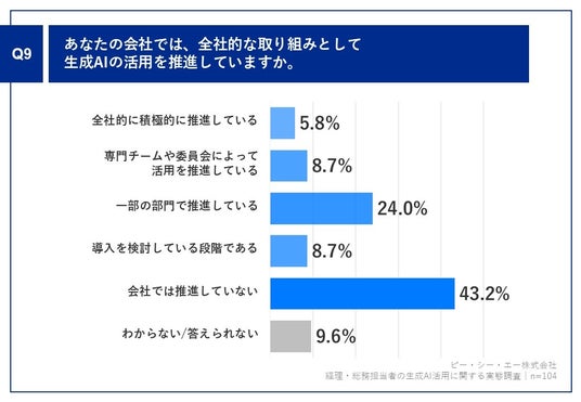 「Q9.あなたの会社では、全社的な取り組みとして生成AIの活用を推進していますか。」(n=104)と質問したところ、「会社では推進していない」が43.2%、「一部の部門で推進している」が24.0%という回答となりました。
