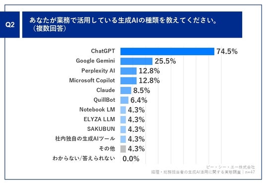 Q1で「毎日活用している」「たまに活用している」と答えた方に、「Q2.あなたが業務で活用している生成AIの種類を教えてください。(複数回答)」(n=47)と質問したところ、「ChatGPT」が74.5%、「Google Gemini」が25.5%という回答となりました。