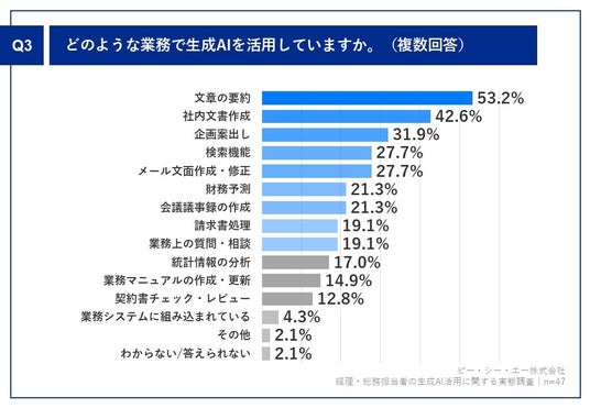 Q1で「毎日活用している」「たまに活用している」と答えた方に、「Q3.どのような業務で生成AIを活用していますか。(複数回答)」(n=47)と質問したところ、「文章の要約」が53.2%、「社内文書作成」が42.6%、「企画案出し」が31.9%という回答となりました。