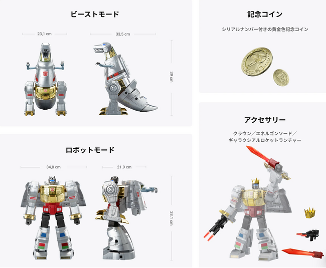 ロボットモードで持たせることができるエネルゴンソードとギャラクシアルロケットランチャーはLEDライトで発光します。また、マーベルコミックでオートボットのリーダーとなった姿を再現できる王冠、グリムロックが描かれたオリジナル記念コインが付属します。