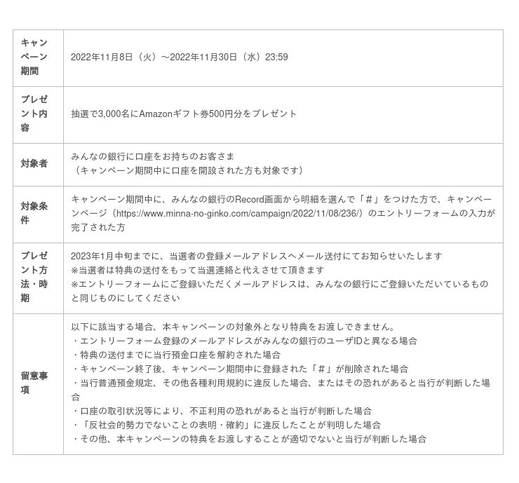 2.本キャンペーンは 株式会社みんなの銀行による提供です。本キャンペーンについてのお問い合わせはAmazonではお受けしておりません。みんなの銀行キャンペーン事務局【メールアドレスや電話番号】 までお願いいたします。