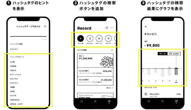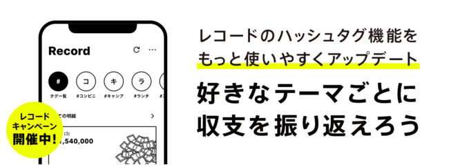 ハッシュタグ機能とは、明細にハッシュタグをつけてメモすることで、自分の好きなテーマごとにグルーピングし、お金の出入りを振り返ることができる機能です。今回のハッシュタグ機能のアップデートは以下の3点です。