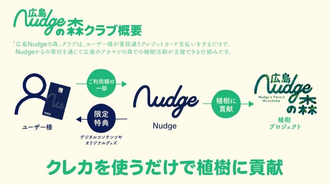 2022年8月、ナッジは、広島県東広島市入野財産区及び賀茂地方森林組合と協定を結び、次世代型クレジットカード「Nudge」を利用することによって広島の森林再生に貢献ができる「広島Nudgeの森」クラブおよびクレジットカードの提供を開始しました。