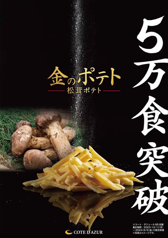 株式会社快活フロンティア(代表取締役社長:竹島 文明)が運営するカラオケ「コート・ダジュール」で販売中の松茸味のポテト、「金のポテト」が発売開始の2023年12月11日(月)から2024年8月9日(金)までの期間で5万食を突破いたしました。松茸特有の芳醇な香りを、ぜひ、お近くのコート・ダジュールにてお楽しみください。