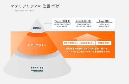 当社は2022年12月公表の中期経営計画において、「人と社会、環境との共生と調和を実現する」ことをPurpose(存在意義)として掲げております。このPurpose(存在意義)を実現するため、自らの強みを活かした経営理念の実現を目指し、「財務的価値の向上」「社会的価値の向上」「経営基盤の強化」を目的とした8つの マテリアリティ(重要課題)を特定いたしました。