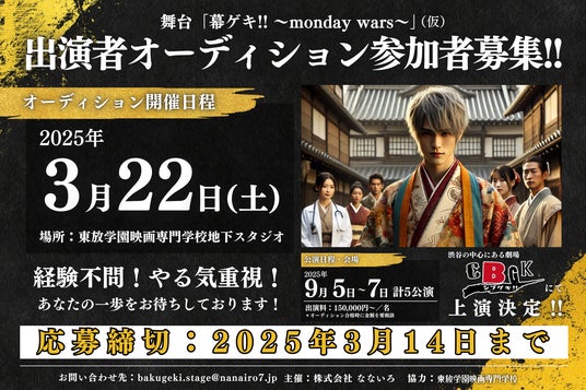 このたび、芸能事務所なないろ(株式会社七色 代表取締役:佐々木 綾香)は、2025年9月に上演予定の舞台「幕ゲキ!! ~monday wars~」(仮)の出演者オーディションを開催します。