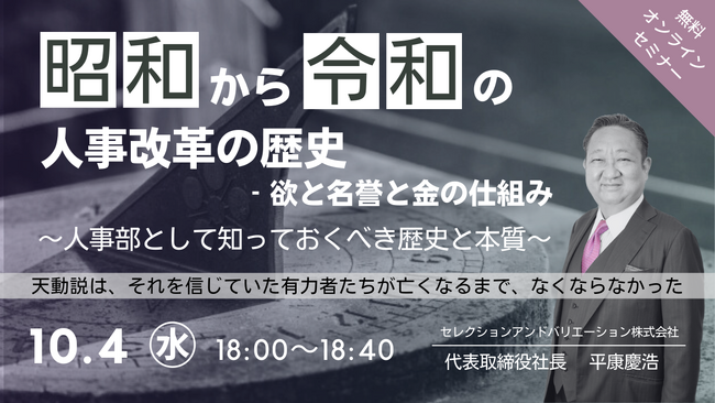 組織・人事コンサルティングファームであるセレクションアンドバリエーション株式会社(以下、当社、東京都港区青山、大阪市西区、名古屋市西区 / 代表取締役社長:平康慶浩/ URL:https://sele-vari.co.jp/)は【夕学セミナー】「昭和から令和の人事改革の歴史-欲と名誉と金の仕組み」~人事部として知っておくべき歴史と本質~を2023年10月04日 (水)18:00~18:40に開催することをお知らせいたします。