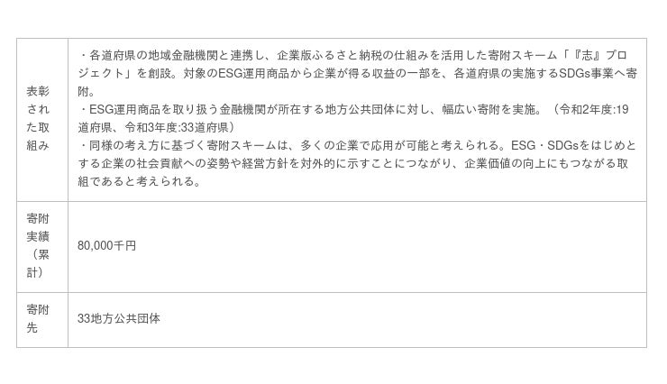 野村アセットマネジメント株式会社(CEO兼代表取締役社長:小池広靖、以下「当社」)は、内閣府が実施する令和4年度「地方創生応援税制(企業版ふるさと納税)に係る大臣表彰」の企業部門を受賞しました。企業版ふるさと納税の仕組みを活用し、当社のESG運用戦略商品の販売残高に応じて当社の収益の一部を、各道府県において地方公共団体が実施するSDGs関連事業に寄附する取組み「『志』プロジェクト」※1が評価されました。