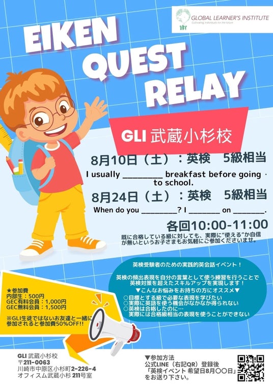 GLI武蔵小杉は今年度、新しい英語イベントプログラム「Eiken Quest Relay」を企画し、多くの方々からご好評を頂いております。ご要望にお応えし、今回、第5回目の追加開催が決定しました。