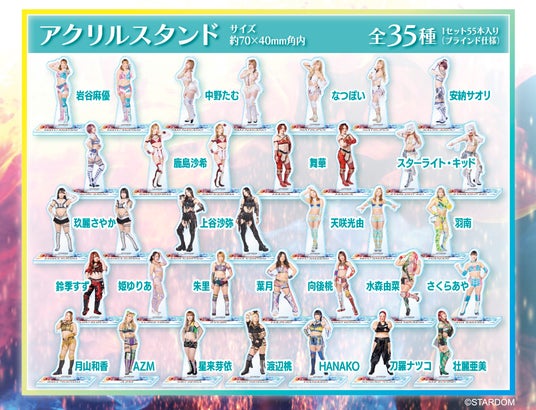 今作では岩谷麻優、中野たむ、なつぽい、安納サオリ、鹿島沙希、舞華、スターライト・キッド、玖麗さやか、上谷沙弥、天咲光由、羽南、鈴季すず、葉月、向後桃、姫ゆりあ、朱里、水森由菜、さくらあや、月山和香、AZM、星来芽依、渡辺桃、HANAKO、刀羅ナツコ、壮麗亜美の全25選手・35種類を収録。
