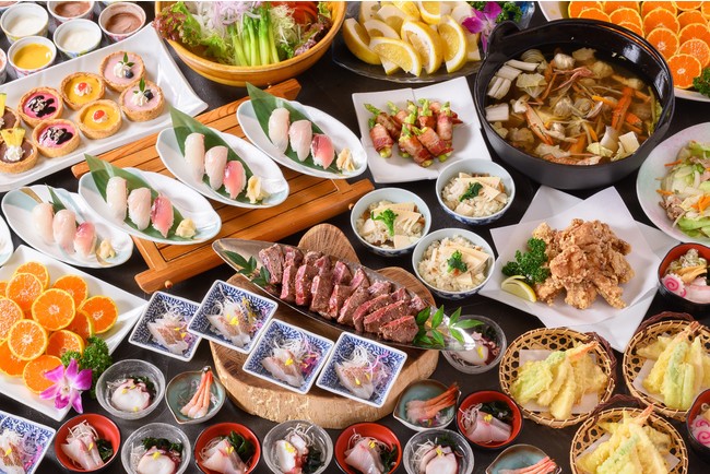 愛媛ブランドの媛スマは握り寿司でご用意。その他にも、瀬戸内海や宇和海産の新鮮な魚の寿司や造り、豊かな自然の中で育てられた愛媛県産牛のステーキ、温暖な気候と西日本最高峰の「石鎚山」の伏流水で育てた地元野菜、デザートやフルーツも“柑橘王国えひめ”ならではの食材がならびます。ご当地グルメも充実、愛媛の魅力を存分に味わっていただけるビュッフェです。