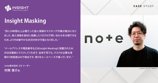株式会社インサイトテクノロジー(本社所在地:東京都渋谷区、代表取締役社長 CEO:森田 俊哉、以下:インサイトテクノロジー)は、個人情報を保護しながら生成AIを活用できる体制づくりを目的として、自社開発のデータマスキングソフトウェア「Insight Masking」がnote株式会社(本社所在地:東京都千代田区、代表取締役CEO:加藤 貞顕)に導入されたことをお知らせします。