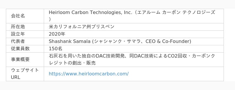 三井物産株式会社(本社:東京都千代田区、社長:堀 健一、以下「三井物産」)は、大気中から直接CO2を回収するDAC(Direct Air Capture)のテクノロジー開発と事業推進を行う米国Heirloom Carbon Technologies, Inc.(エアルーム、以下「Heirloom社」)による第三者割当増資を引き受けました。