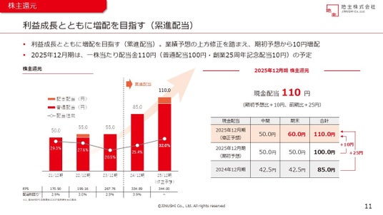 2025年12月期 連結業績予想の上方修正を踏まえ、1株当たり年間配当金を期初予想から10円増配し、1株当たり110円(創業25周年記念配当10円を含む)といたしました。