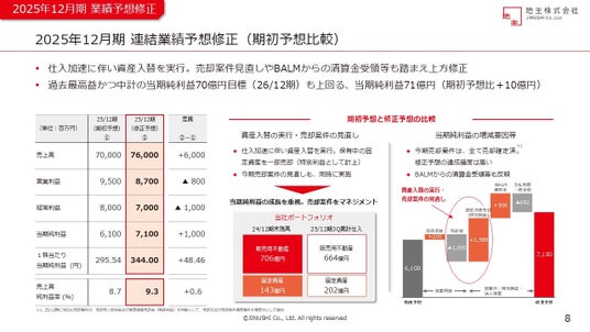 当期純利益は、過去最高益を更新するとともに、中期経営計画で掲げる当期純利益70億円(2026年12月期)を前倒しで達成する見通しです。なお、営業利益及び経常利益の減少については、資産入替による固定資産の売却(特別利益の計上)を踏まえ、売却案件を見直したことによるものです。