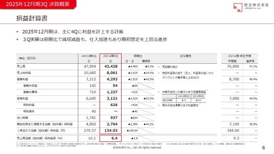 2025年12月期は、主に第4四半期に利益を計上する計画です。第3四半期実績は前期比で減収減益となりましたが、仕入加速もあり、期初予想を上回って進捗しております。