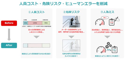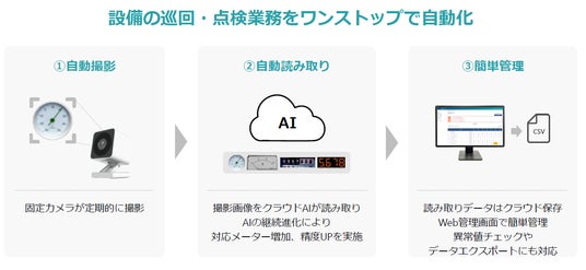 工場や設備のメーター・ランプをカメラで自動撮影し、そのデータをAIが読み取り、記録することで、巡回点検の手間を省きます。