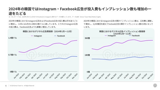 韓国におけるコンシューマーブランドのInstagram広告とFacebook広告の投入費は、2024年1月から11月にかけて増加し続けて累計で17億5,000万ドルに達し、それに伴ってインプレッション数が4,790億回を超えています。