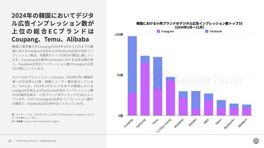 韓国EC業界最大手Coupangの2024年1月から11月までの韓国におけるInstagram広告およびFacebook広告の合計インプレッション数は147億回に達し、韓国EC市場で広告出稿を最も大規模に行う小売ブランドとなっています。Temuは、韓国におけるInstagram広告およびFacebook広告のインプレッション数が108億回を超え、小売企業別ランキングで3位に入っています。