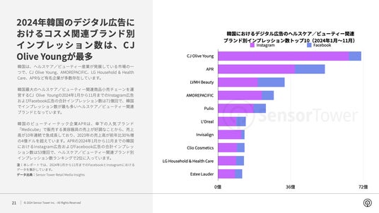 韓国はヘルスケア/ビューティー産業が発展している市場の一つで、CJ Olive Young、AMOREPACIFIC、LG Household & Health Care、APRなど有名企業が多数存在しています。韓国最大のヘルスケア/ビューティー関連商品小売チェーンを運営するCJ Olive Youngの2024年1月から11月までのInstagram広告およびFacebook広告の合計インプレッション数は71億回で、韓国でインプレッション数が最も多いヘルスケア/ビューティー関連企業となっています。
