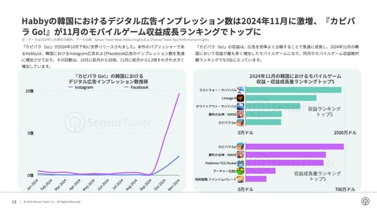『カピバラ Go!』の収益は、広告を効率よく出稿することで急速に成長し、2024年11月の韓国において収益が最も多く増加したモバイルゲームになり、同月のモバイルゲーム収益絶対額ランキングでも5位に入っています。