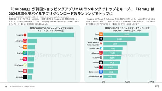 徹底的にローカライズされたサービスとスピード配達を提供する『Coupang』は、韓国におけるショッピングアプリでトップの地位を強固に築いており、『Coupang』の2024年1月から11月までのMAU(月間アクティブユーザー数)は、前年同期から8%増加し、ショッピングアプリにおけるトップの座をキープしています。