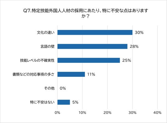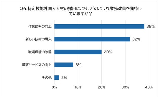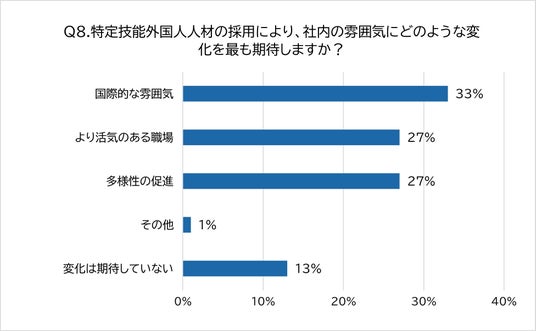 また、「より活気のある職場」や「多様性の促進」といった変化を期待する割合は、どちらも27%に上りました。この結果からは、特定技能外国人人材の採用により、自社の職場環境が変化するきっかけになることを期待している様子がうかがえます。