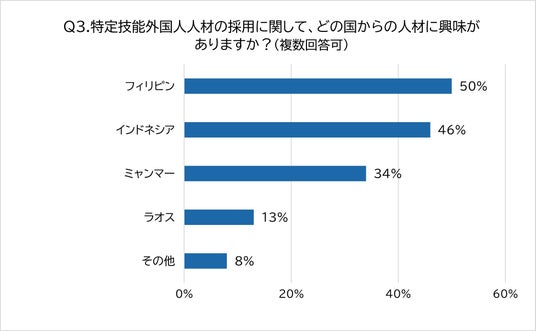 どの国の特定技能外国人人材に興味があるかというアンケートでは、「フィリピン」が約50%と最も多く、次いで「インドネシア」が46%、「ミャンマー」が34%という結果になりました。