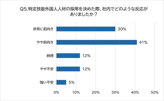 特定技能外国人人材の採用を決めた際、社員の反応として多かったのは「非常に前向き」(30%)や「やや前向き」(41%)であり、社員の約7割が前向きであったという結果となりました。また、採用に関して「納得」(12%)している層もいることから、人手不足の解消などを図るために、特定技能外国人人材に期待が寄せられていることがうかがえます。