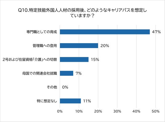 特定技能外国人人材のキャリアパスで想定しているものとして、最も回答が集まったのは「専門職としての育成」(47%)で、次いで「管理職への登用」(20%)となっています。そもそも特定技能外国人は、特定産業分野においてすでに一定レベル以上のスキルを有していることから、より優秀な働き手への成長を期待していることがうかがえます。