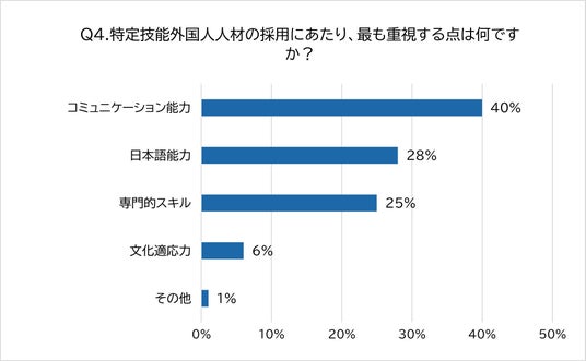 特定技能外国人人材を採用するうえで重視した点として、最も回答が多かったのは「コミュニケーション能力」(40%)でした。相手と意思疎通を図るコミュニケーション能力が高い外国人人材であれば、既存従業員ともスムーズに打ち解けて、自社に定着してくれる可能性が高まります。