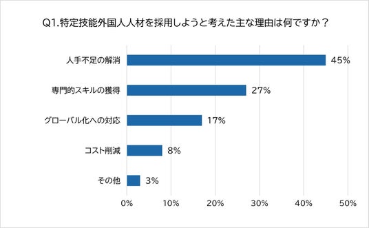 特定技能外国人人材を採用した理由として、最も回答が多かったのは「人手不足の解消」の45%で、次いで「専門的スキルの獲得」の27%という結果になりました。近年は、人手不足によって経営が圧迫される企業も多い傾向にあり、特定技能外国人を採用することで、改善を図ろうとしていることがうかがえます。