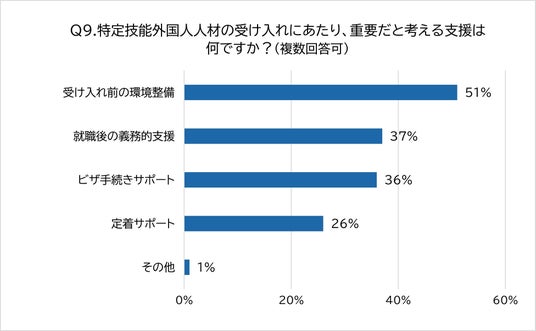 また、「就職後の義務的支援」(37%)や「ビザ手続きサポート」(36%)については、ほぼ同率の回答が集まりました。義務的支援とは、前述の1号特定技能外国人支援計画で規定されている10の支援項目のことです。