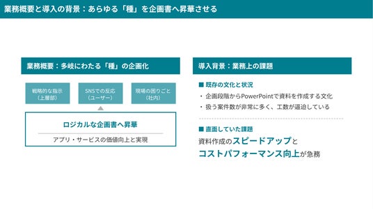 その際、関連する部署に合わせて資料をカスタマイズしなければなりませんので、ベースとなる企画書をマイナーチェンジさせる作業が随時発生します。この「多様なニーズへの対応」と、その土台となる「0からの作成」に膨大な時間を取られていたことが、ツール導入の強い動機となりました。