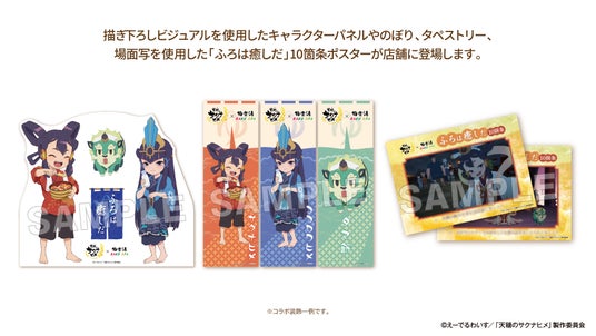 描き下ろしビジュアルを使用したキャラクターパネルやのぼり、タペストリー、場面写を使用した「ふろは癒しだ」10箇条ポスターが店舗に登場します。