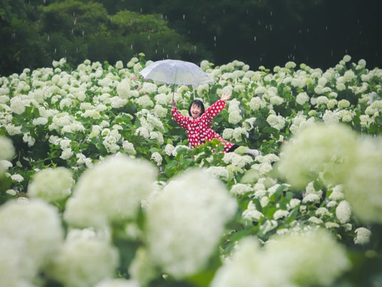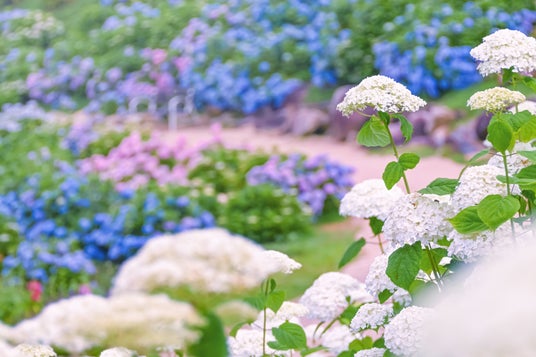 一面を埋め尽くすほど純白のアナベルが咲き広がる、人気の撮影スポットです。