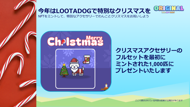 加えて、今回販売されるDOG NFTには、供給数に制限はございませんが、最初にミントされた1,000匹のNFTを保有しているユーザーに対し、特別な限定クリスマスアクセサリーをプレゼントさせていただきます。