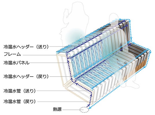 「Comfy TOUCH」は、ベンチなどの家具や床に取り付けた冷温水パネルに、30℃程度に温度調節された水(=冷温水)を流すことにより、熱伝導と輻射熱で冷涼感やぬくもりを得られるシステムです。