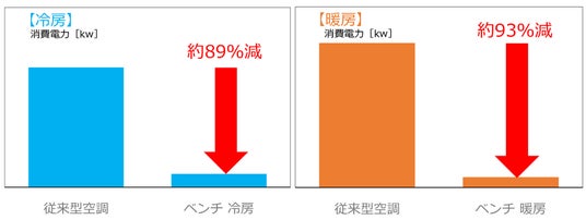 同条件の空間にComfy TOUCH適用のベンチ2基と従来型空調1基のランニングコスト比較(Comfy TOUCH適用ベンチの使用熱源は、空冷ヒートポンプ室外機)