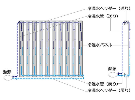 また、パネルに流れる冷温水が30℃前後の中温度帯のため、井戸水や地下水といった自然エネルギーの活用がしやすく、より省エネルギー性能の高い運用も可能です。