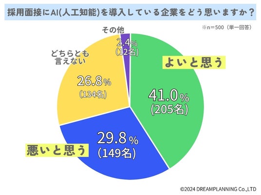 採用面接にAI(人工知能)を導入することについて、よいと思う方が41.0%、悪いと思う方が29.8%どちらとも言えない方が26.8%、その他2.4%という調査結果が出ました。