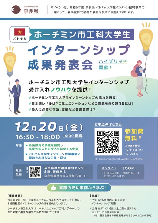 奈良県では、高度外国人材の受入体制づくりや社内の活性化の促進を図るため、ベトナム・ホーチミン市工科大学の学生を県内企業で受け入れ、8週間程度のインターンシップを行う「ベトナム・ホーチミン市工科大学生インターンシップ」を実施しています。