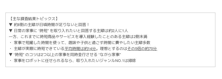 ・ 家事で短縮した時間を使って、趣味や子供と過ごす時間に費やしたい主婦多数
