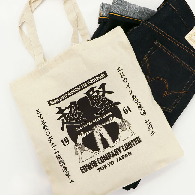 限定ノベルティとして、7周年記念「超堅ジーンズ」をご購入いただいた方にはもれなく特製トートバッグをプレゼント。革ラベルのデザインがプリントされた限定品。