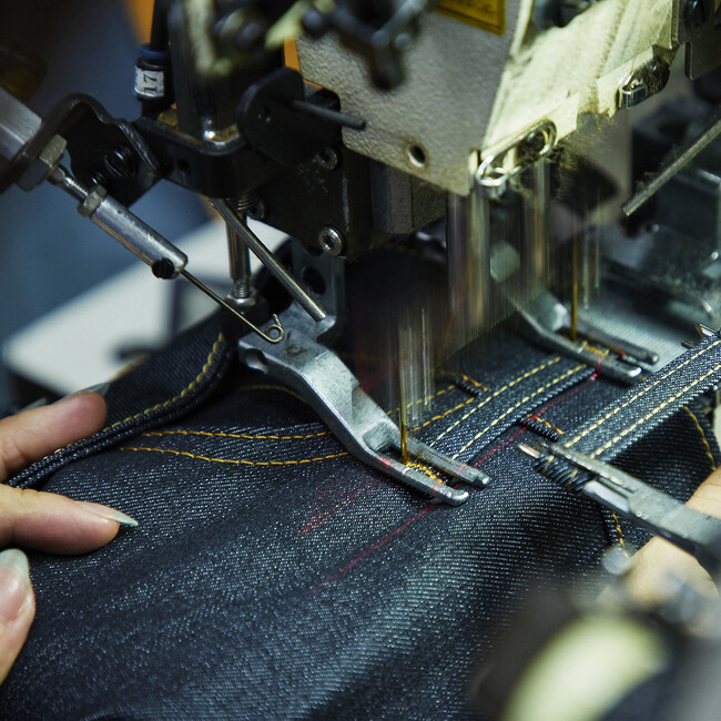 エドウイン専用に独自開発・カスタマイズされた様々なミシンや自動機を使い、細部に至るまで「門外不出」としているきめ細かい約束事を頑なに守ることで作られている。