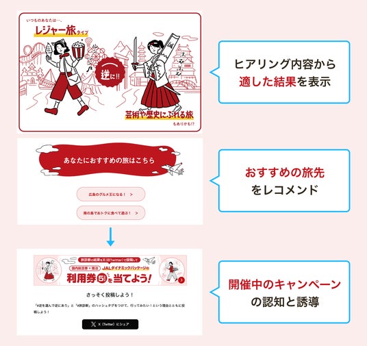 普段顧客が自身では選ばない旅をおすすめすることで、新たな旅や自分との出会いのきっかけを提供するコミュニケーションコンテンツとしても有効であり、JALとのエンゲージメントを高めるツールとしても期待しています。」(JAL担当者より)