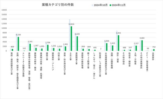 工事に関わる業種カテゴリの多くで、10月と比較すると件数の減少が見られました。