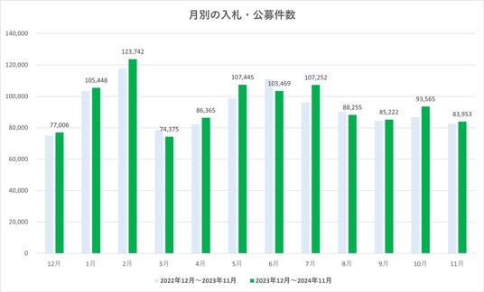 11月の入札・公募件数は少なく、直近1年間の中では3月に次いで少ない件数となりました。ただし、2023年11月と比較すると件数にほぼ差はなく、2024年11月が特に件数が少なかった訳ではないことがわかります。