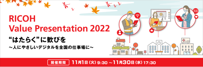 リコージャパン株式会社(社長執行役員:木村 和広、本社:東京都港区、以下 リコージャパン)は、お客様の経営課題や業種ごとの業務課題を解決するためのデジタルサービスや業務プロセス改善について、社内実践事例なども交えてご紹介する「RICOH Value Presentation 2022」を、7、8月の開催に続きまして、オンラインで開催いたします。